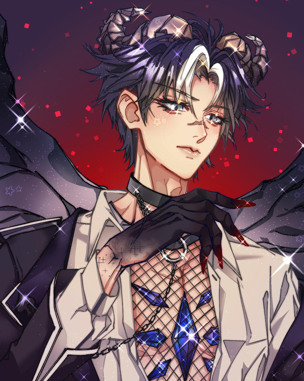 His heart are the diamonds, not one but eight, so it's harder to break him. He will be alive as long as the last diamond is shining. His hands are discolored from using dark magic. His wings are the mark from his past life and can be abandoned to try forgetting about what happened those past few decades.All kinds of fanarts and nsfw arts are acceptable. Have fun.